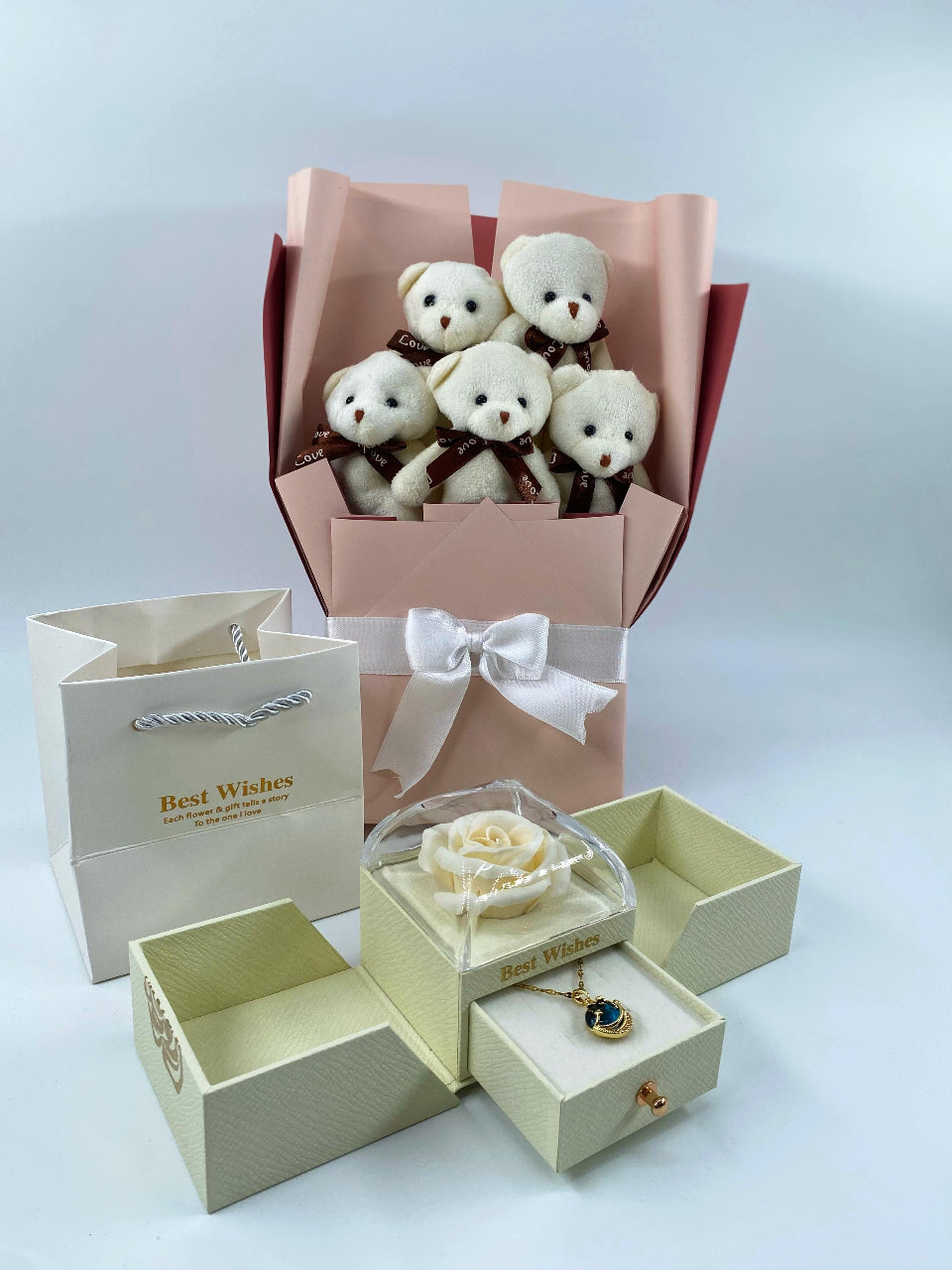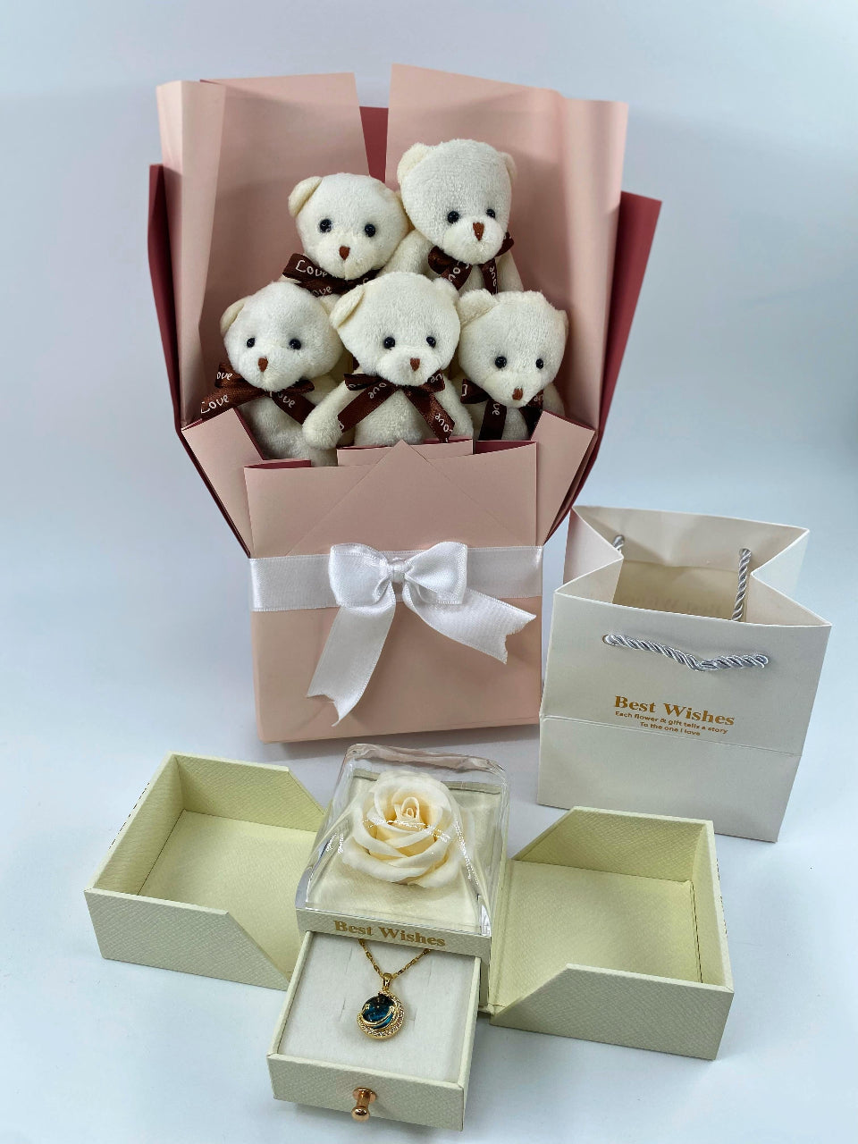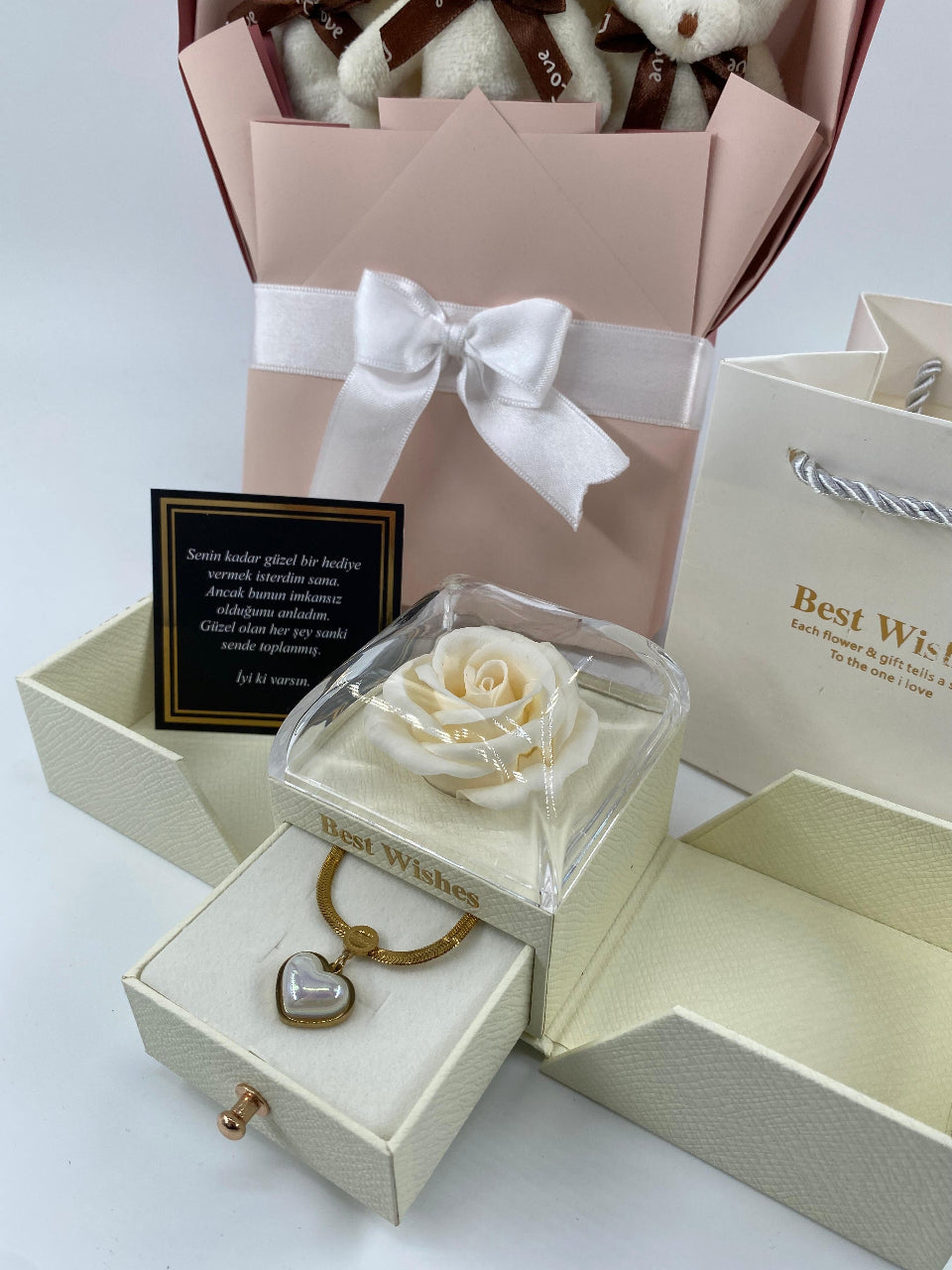 Beyaz Ayıcık Buketi Güllü Kutu 14 Ayar Altın Kaplama kolye set