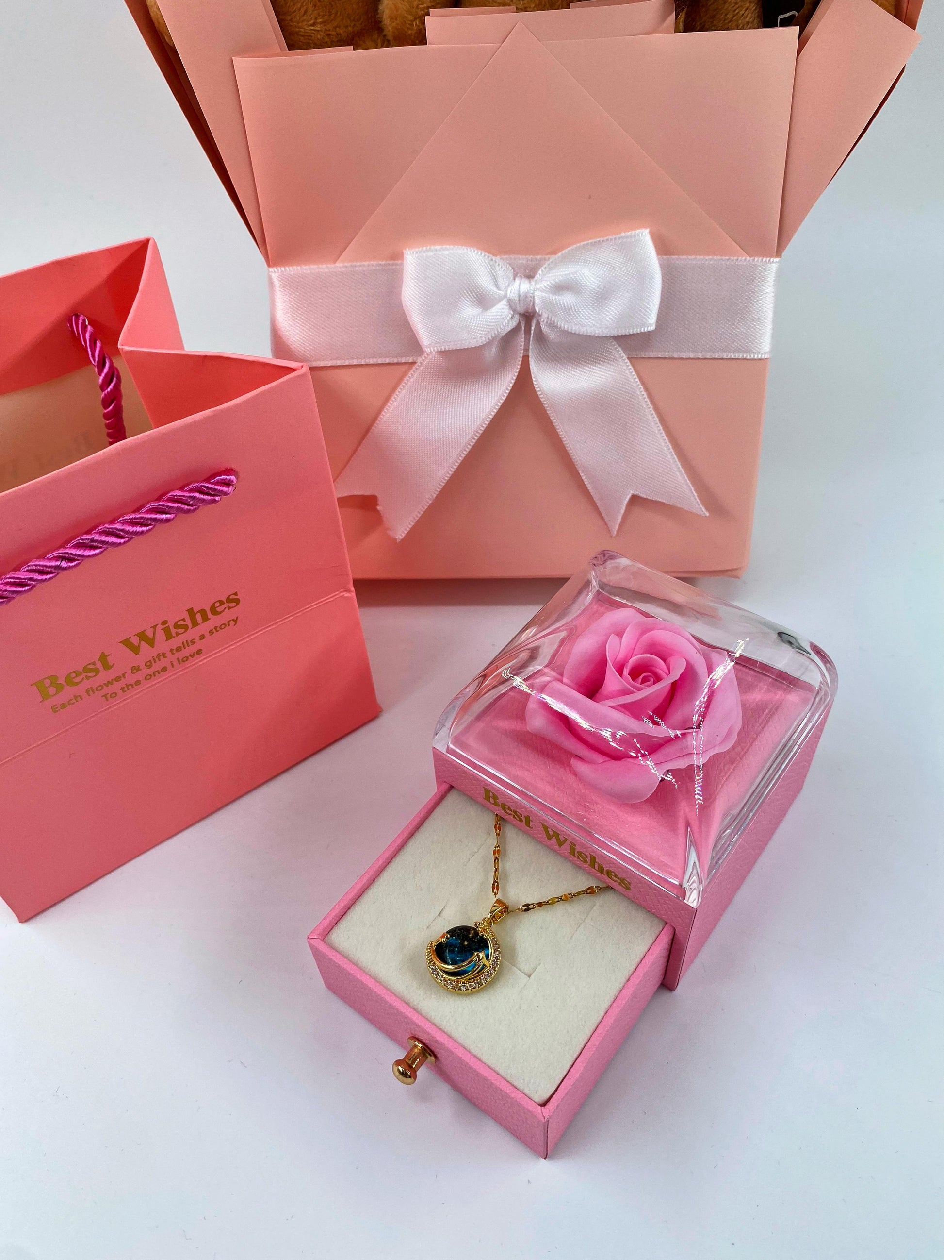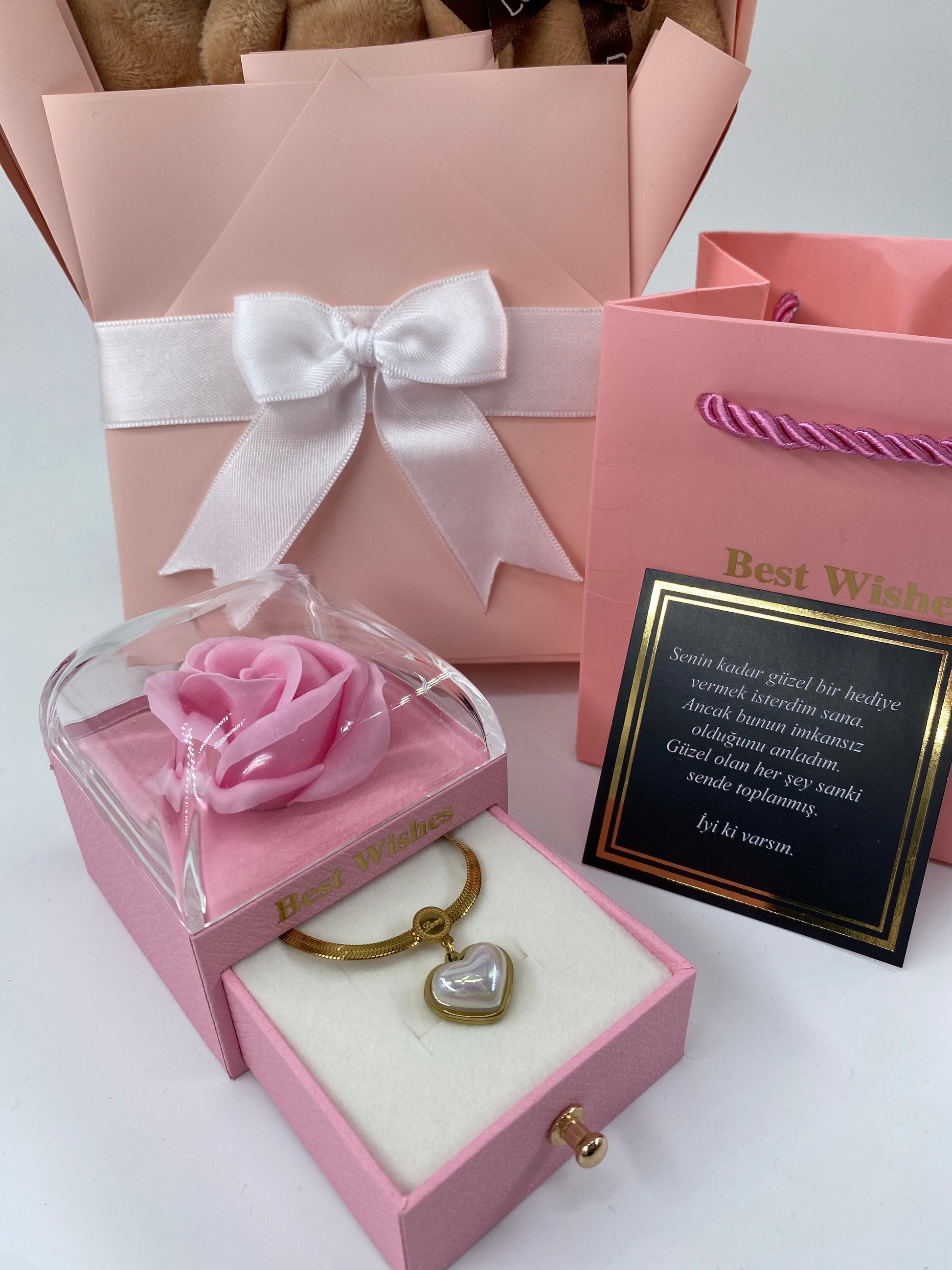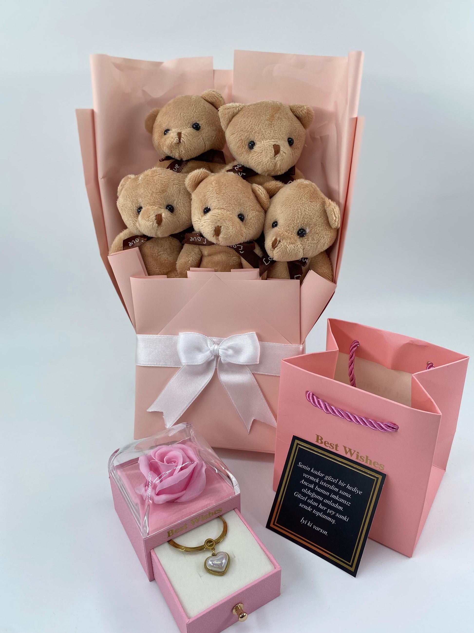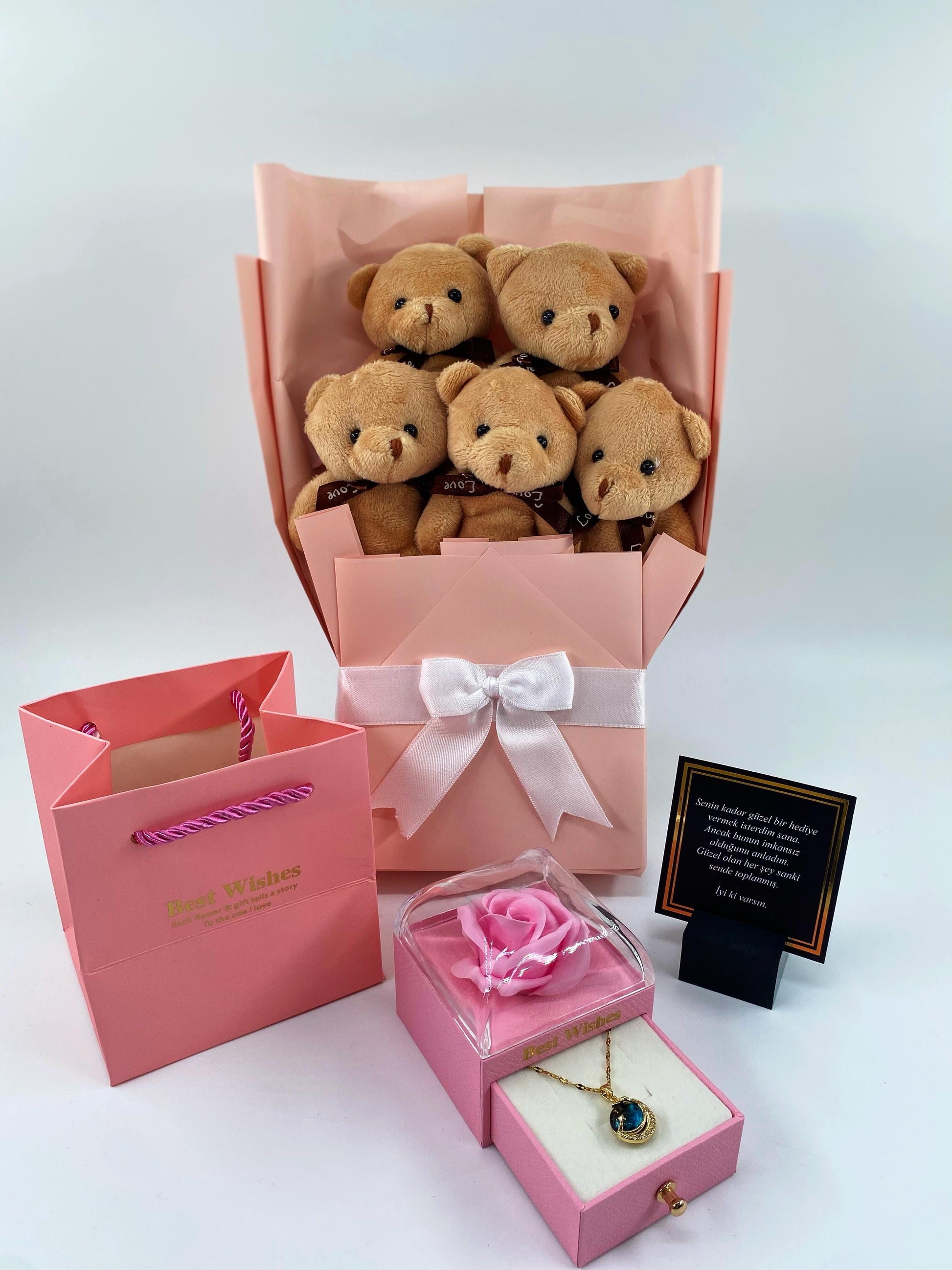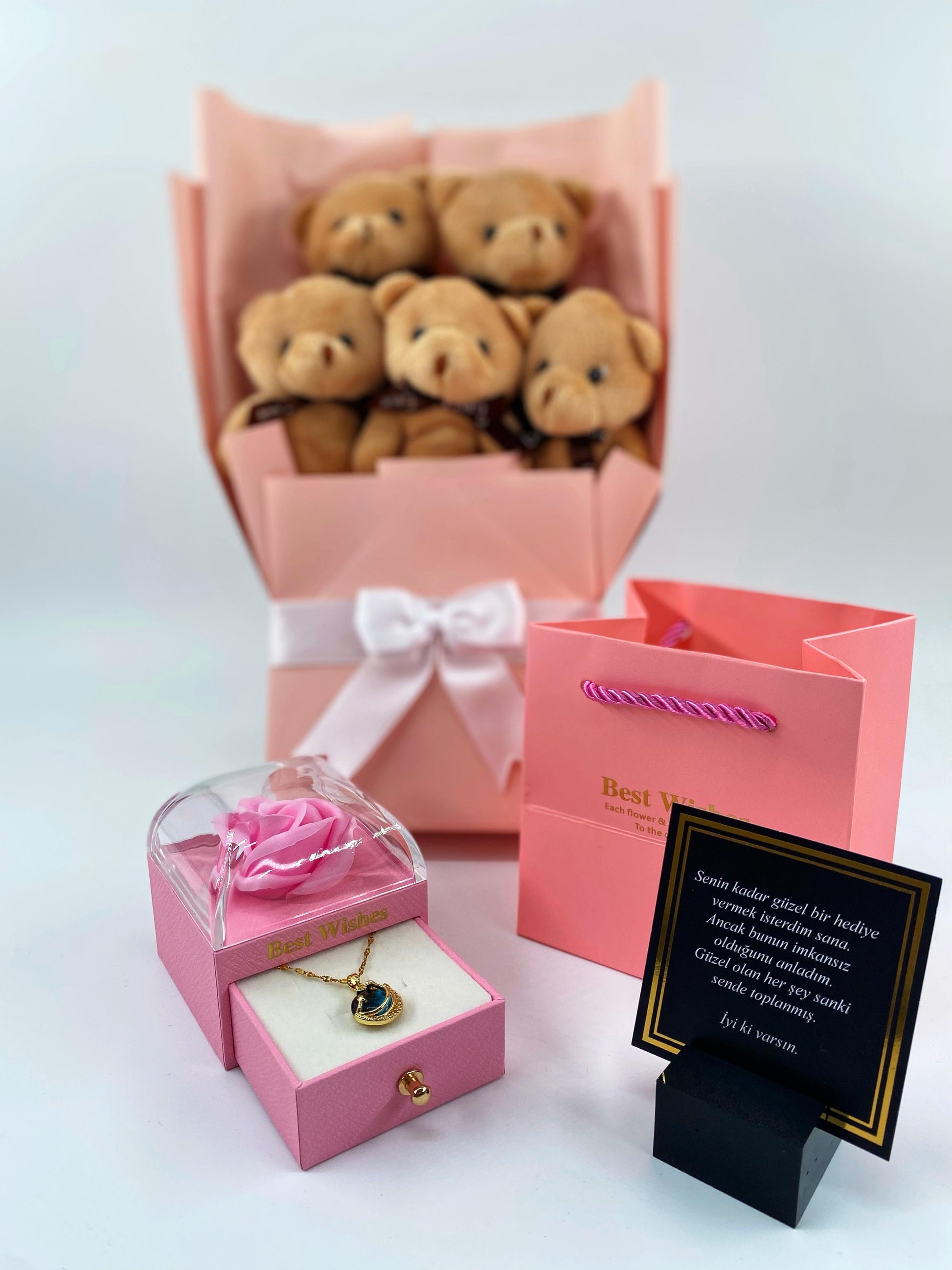 Kahve Ayıcık Buketi Pembe Güllü Kutu 14 Ayar Altın Kaplama kolye set