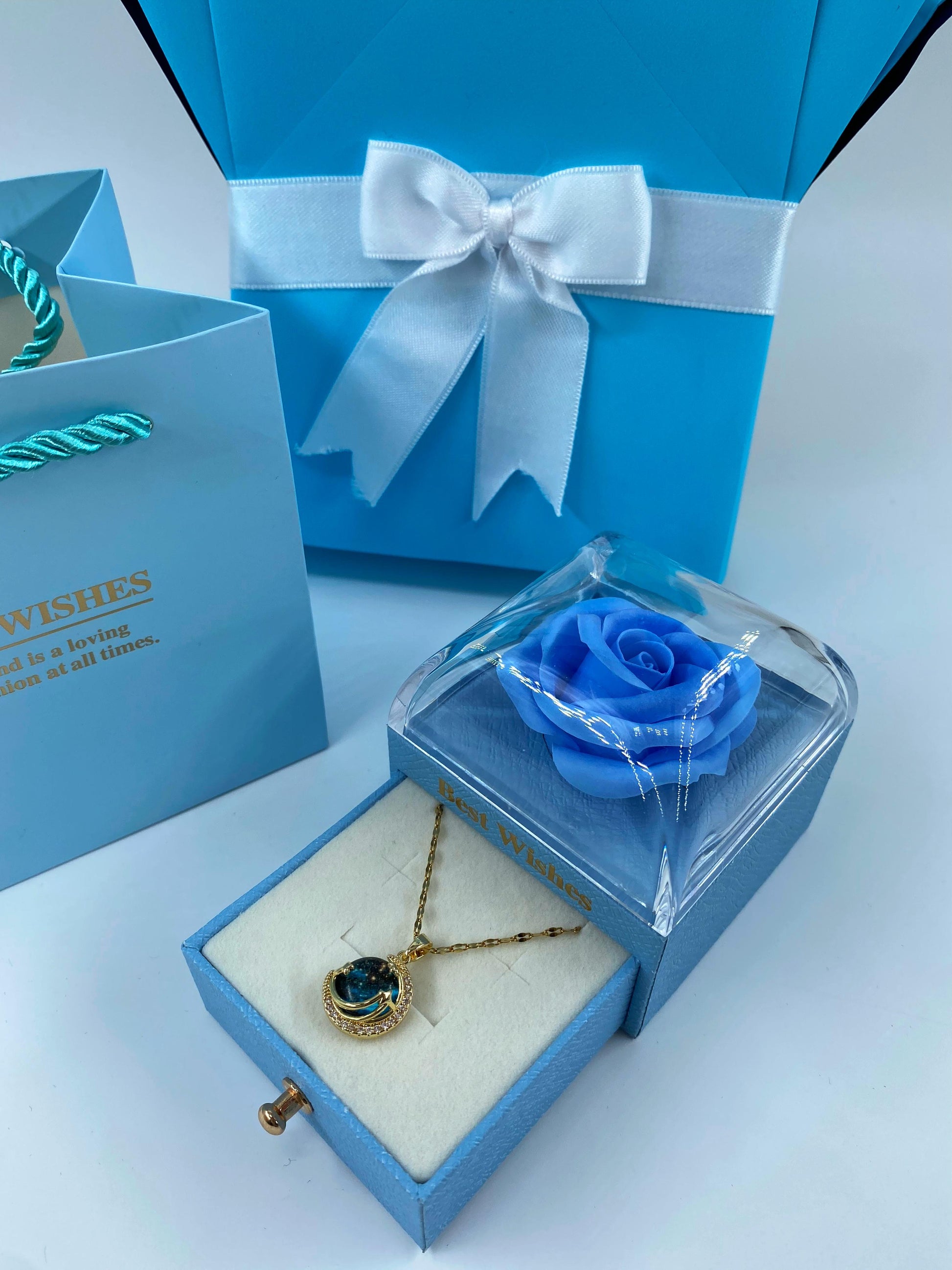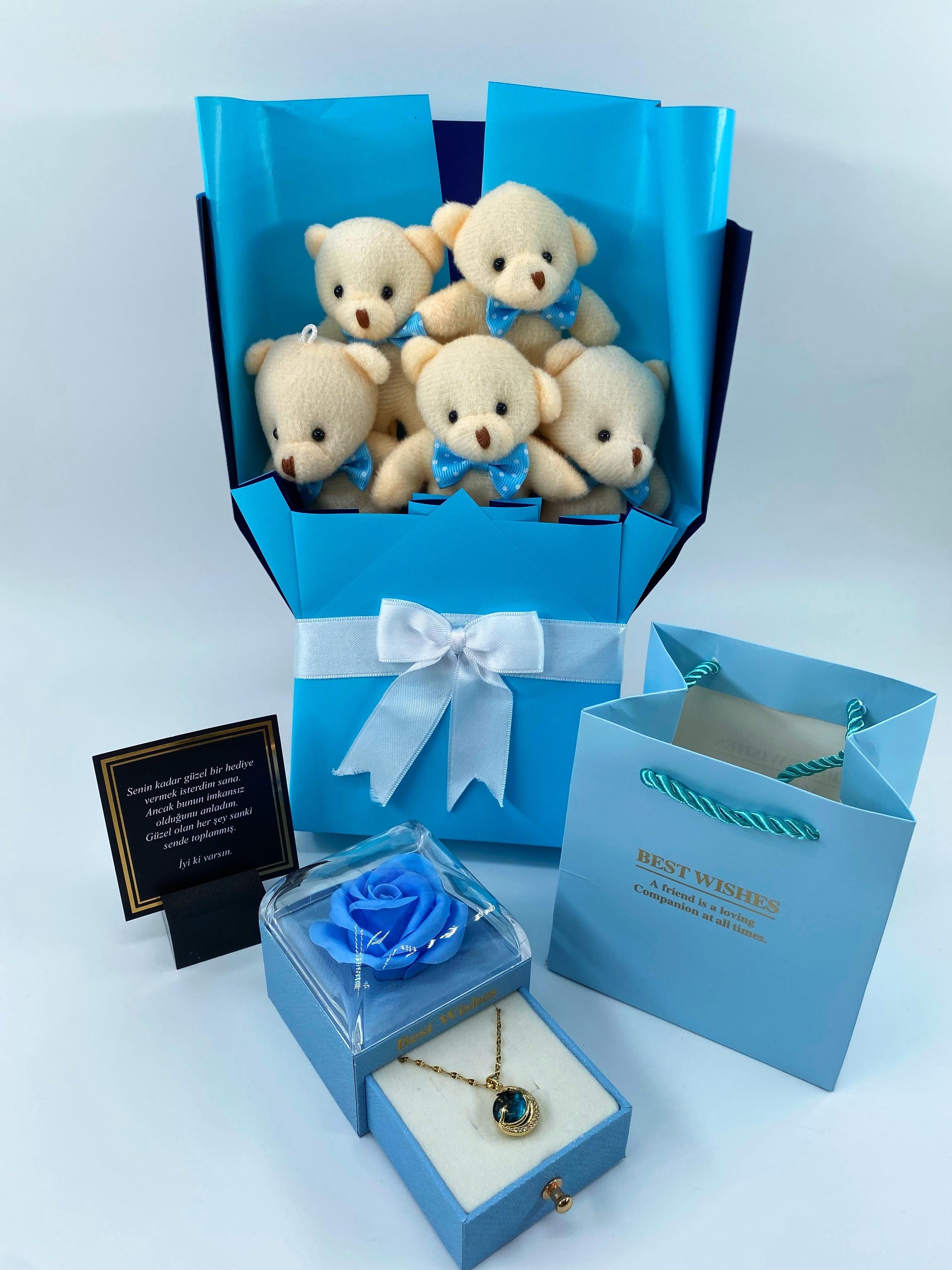 Mavi Ayıcık Buketi Güllü Kutu 14 Ayar Altın Kaplama kolye set